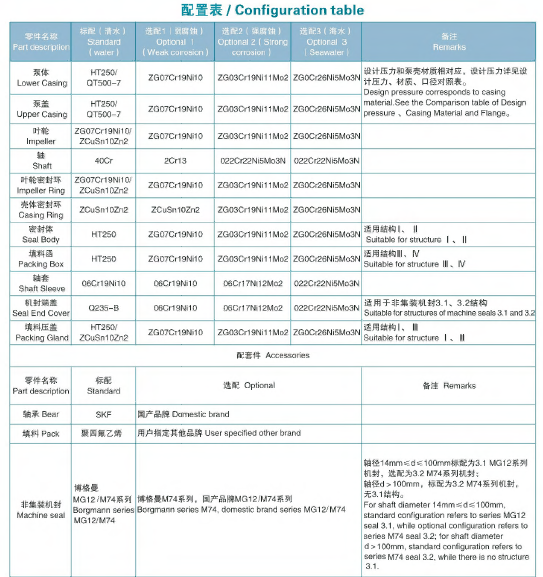 • Suhu standar: -20 ~ 80oC; struktur pendingin digunakan untuk bantalan dan segel mesin: QT500-7 digunakan untuk casing pompa, ≤ 150oC diperbolehkan.