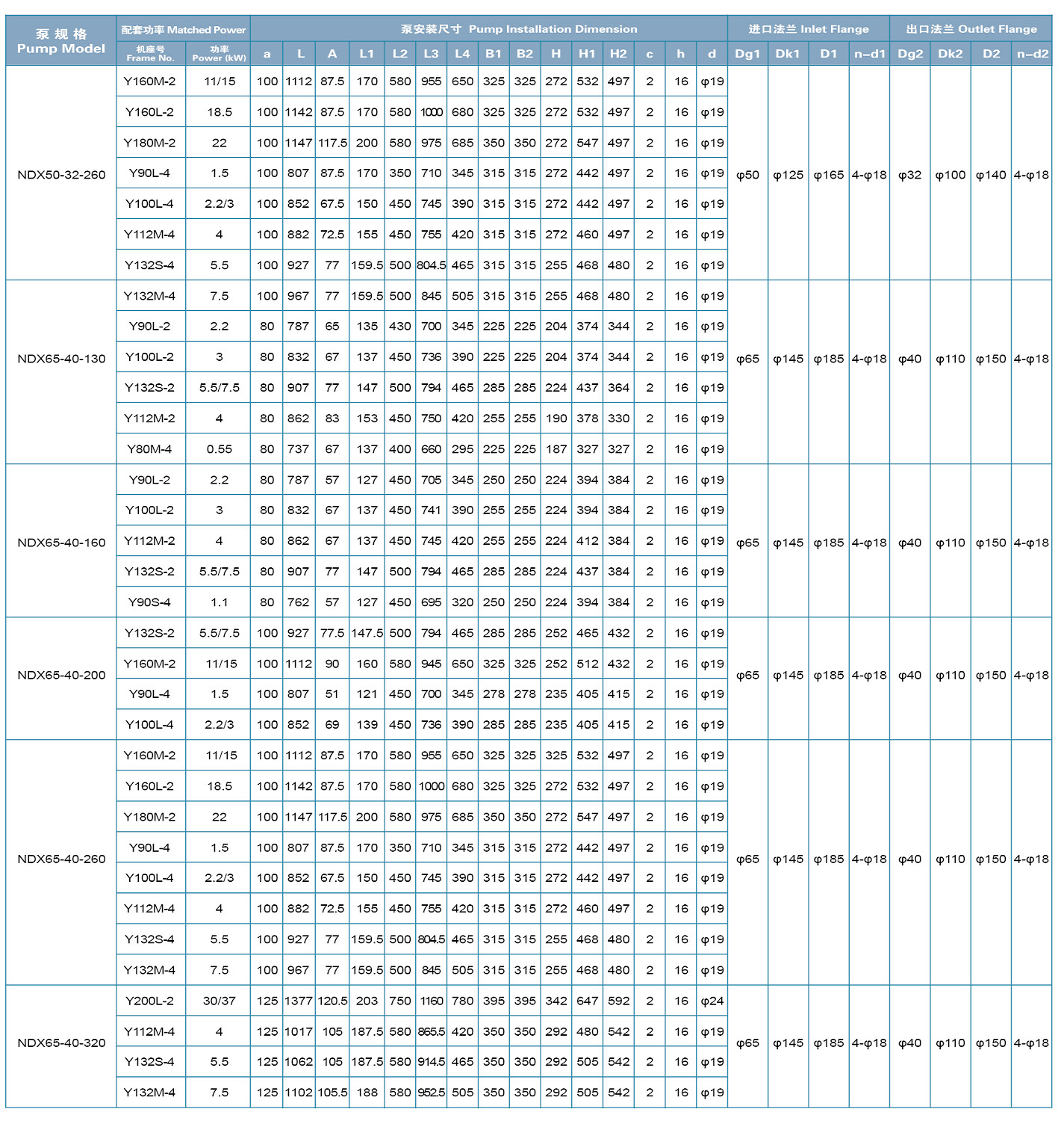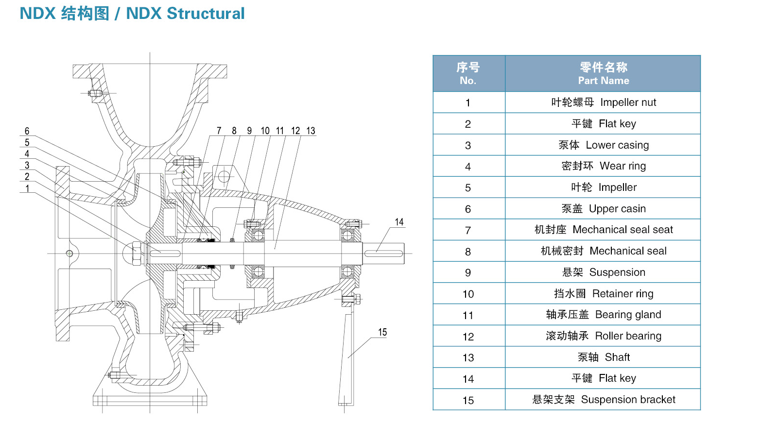 Pompa tipe NDX adalah generasi baru pompa sentrifugal end suction dengan  efisiensi tinggi dan hemat energi yang dikembangkan oleh perusahaan kami berdasarkan pompa sentrifugal end suction tipe IH sebelumnya, yang digunakan untuk memompa air bersih dan cairan yang sifat fisik dan kimianya mirip dengan air dan tanpa partikel padat. Pompa ini banyak digunakan di pabrik, tambang, pasokan dan drainase air perkotaan, HVAC, segmen industri dan irigasi dan drainase lahan pertanian, dll. Pompa ini juga dapat digunakan dalam stabilisasi tekanan dan sistem pasokan air untuk pengendalian kebakaran perkotaan.