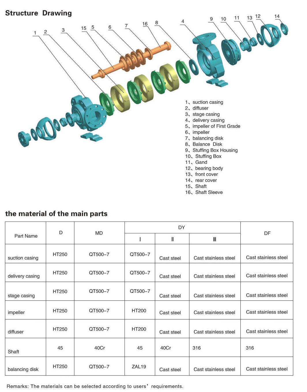 Pompa tipe MD berlaku untuk pekerjaan drainase di pekerjaan baja dan tambang, dimaksudkan untuk mengalirkan drainase tambang dan limbah lainnya yang kandungan padatnya tidak melebihi 2% dan partikelnya tidak melebihi o,5 mm.