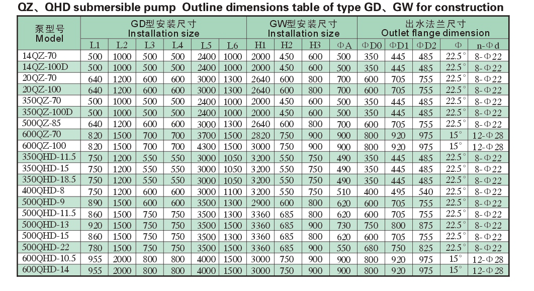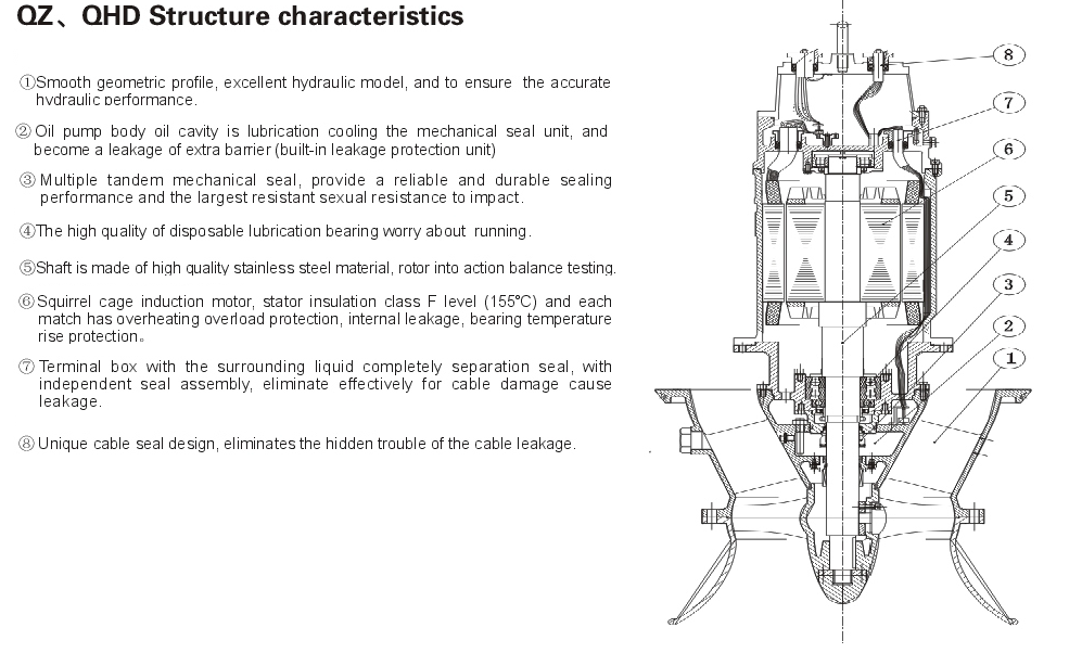 Jenis pompa Submersible Axial Flow QZ dari pompa submersible. QHD guide vane dari pompa submersible, QHL volute diving campuran pompa aliran terutama dan dalam memompa air atau sifat kimia fisik mirip dengan air cair lainnya, memompa suhu menengah tidak melebihi 40 °C .