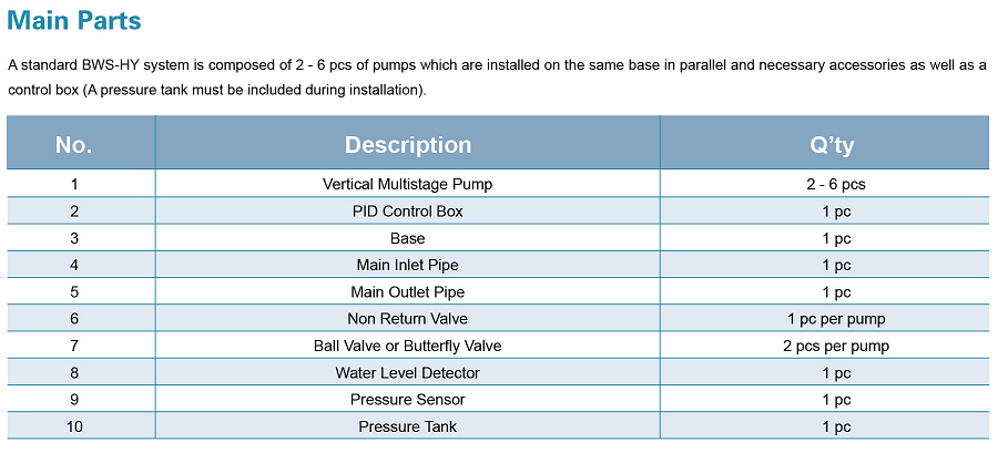 Seri BWS mencakup Sistem Pasokan Air Non-negatif WG, Sistem Pasokan Air Non-negatif WX, Sistem Pasokan Air Konstan HY dan Sistem Pasokan Air Peningkat ZY. Bersama dengan pompa Limbah WQ. Pompa pemadam kebakaran XBD, pompa saluran LPP dan pompa hisap ujung LEN, kami memiliki rangkaian lengkap untuk memenuhi aplikasi pasokan air sekunder, drainase, pemadam kebakaran, dan HVAC.