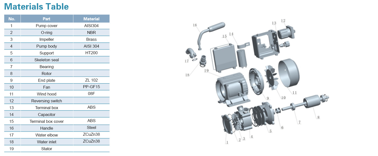 Motor dilengkapi dengan sakelar mundur untuk memungkinkan pompa berputar ke dua arah. Sisi hisap dapat digunakan untuk pengiriman, sisi pengiriman dapat digunakan untuk hisap.